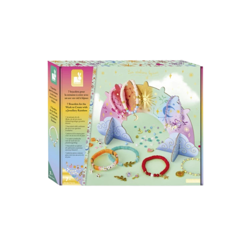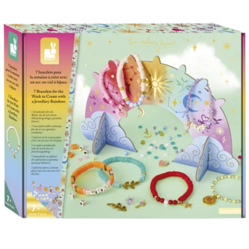 ¡Una pulsera para cada día de la semana! Con este kit creativo para hacer pulseras, los niños y niñas a partir de 7 años podrán diseñar y confeccionar 7 pulseras únicas, cada una con un color y una energía diferente. Una actividad divertida y relajante que estimula la paciencia, la concentración y la expresión personal.