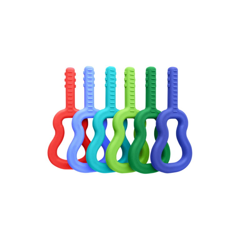 El Guitar Chew de ARK es un collar mordedor con forma de guitarra diseñado para ofrecer estimulación oral de manera divertida y eficaz. Su cuerpo liso es fácil de sujetar, mientras que el mástil con relieves y protuberancias simula trastes, cuerdas y clavijas, proporcionando una experiencia sensorial adicional y permitiendo alcanzar los molares posteriores. Es adecuado tanto para niños como para adultos.