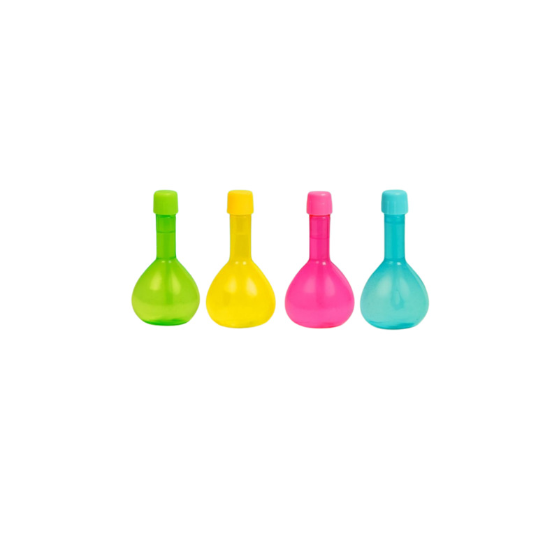 Cada frasco incluye líquido para pompas de jabón y una varita sopladora. Disponible en cuatro colores: azul, amarillo, verde y rosa. El color se enviará según disponibilidad en el momento de preparar el pedido.
