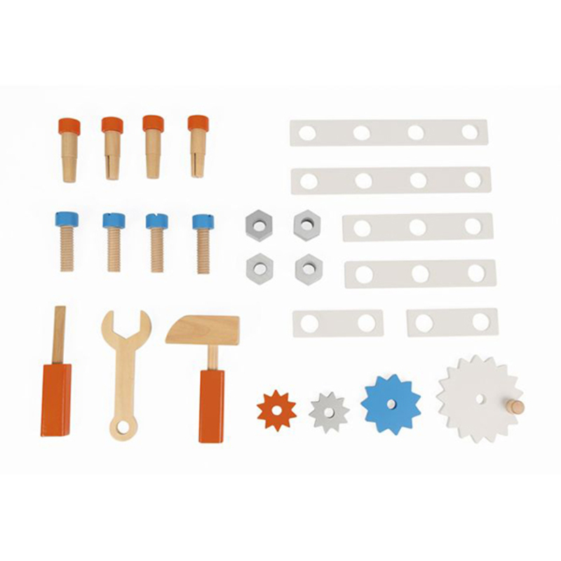 Cuenta con un montón de accesororios con los que podrán inventar, montar y desmontar todo lo que se les ocurra: 3 herramientas magnéticas, un tornillo de banco, un sistema de engranaje de 4 ruedas, 18 accesorios (4 clavos, 4 tornillos, 4 tuercas, 6 placas).
