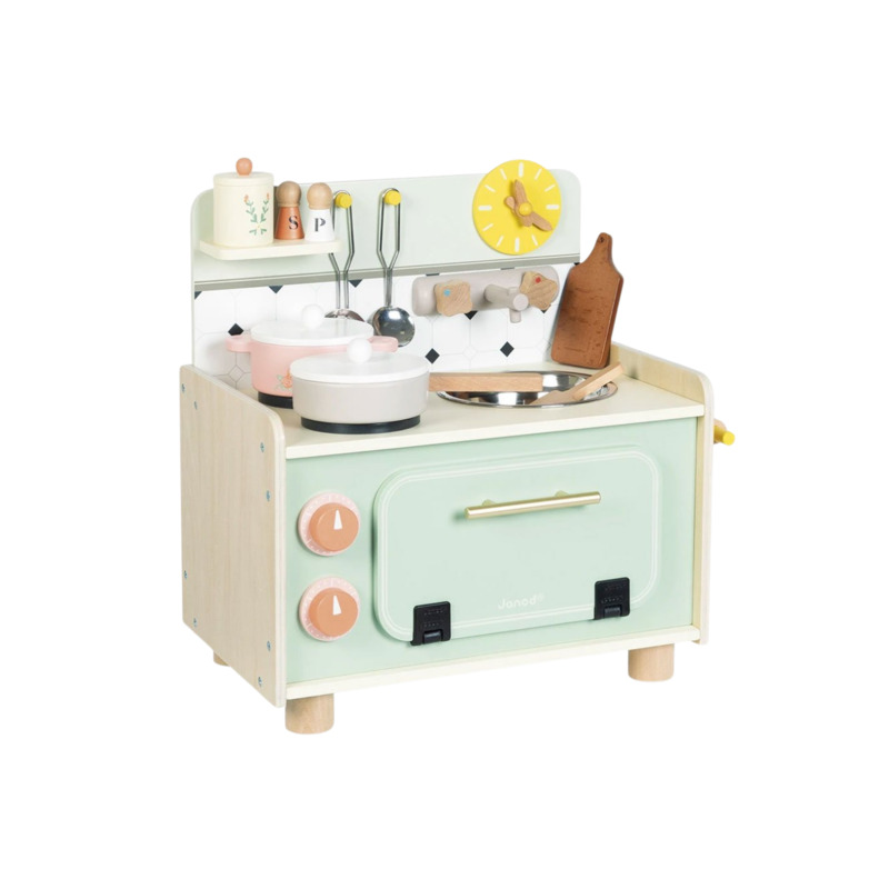 Una cocina pequeña de una abuelita alegre y una torre de equilibro.