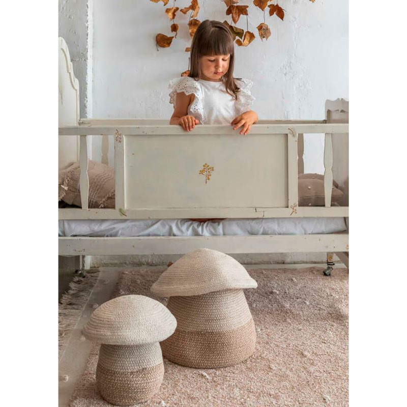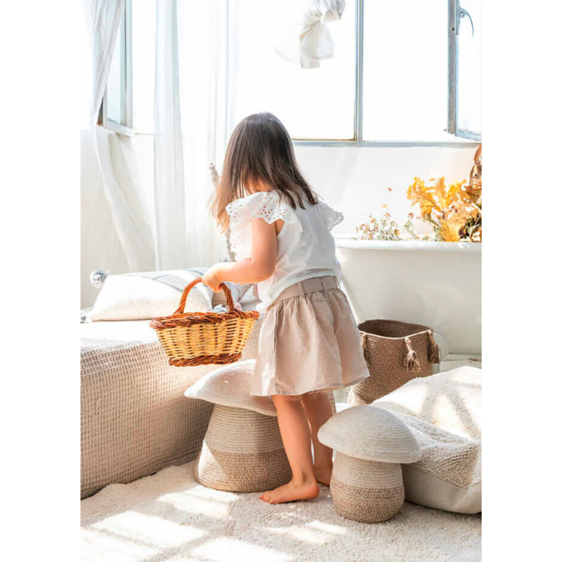 La Cesta Mamá Seta de Lorena Canals es una preciosa cesta de almacenaje infantil hecha a mano, perfecta para añadir un toque de naturaleza y encanto a la habitación de los niños. Con su diseño inspirado en una seta del bosque, esta pieza artesanal forma parte de la colección Cotton Woods, una línea que celebra la belleza de los materiales naturales y el juego imaginativo.