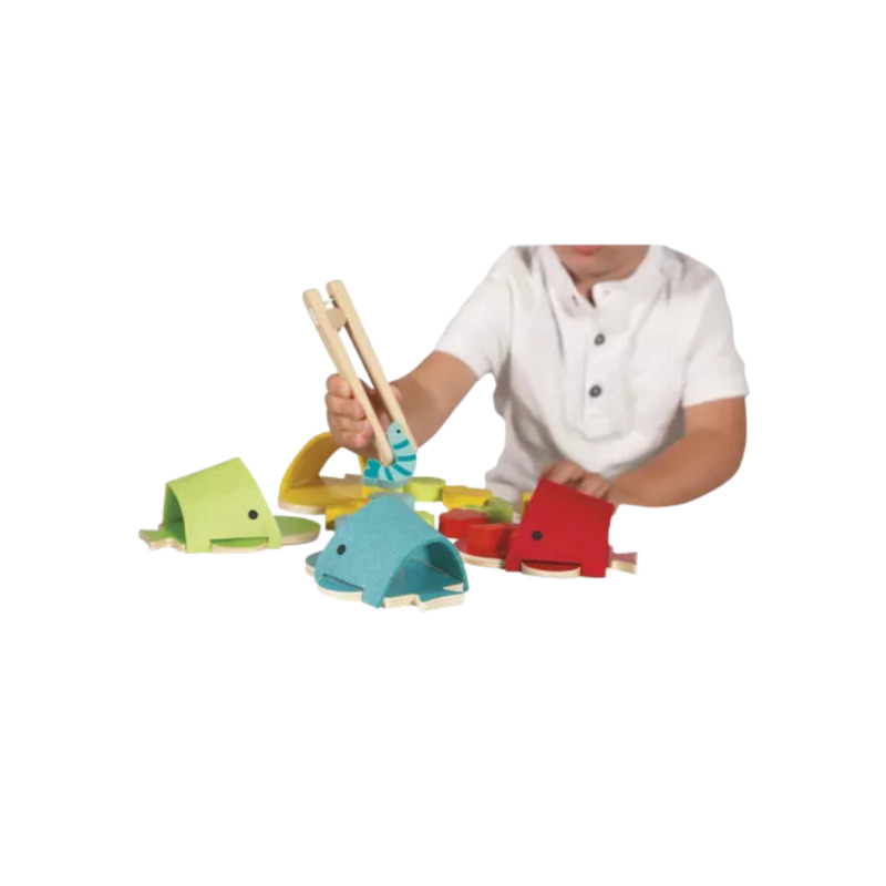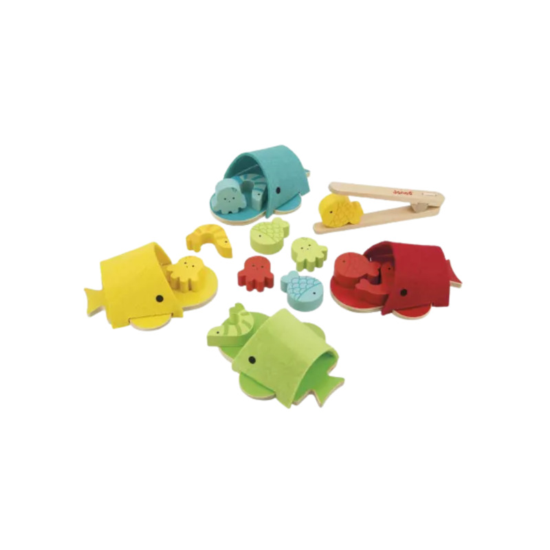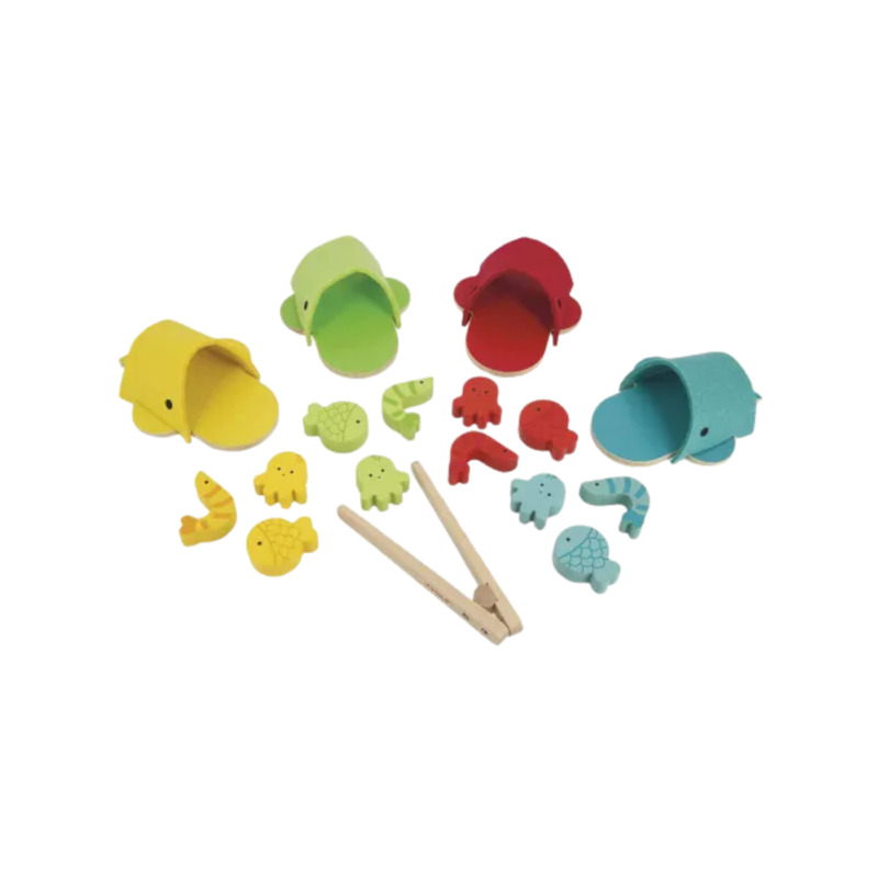 El set incluye 4 ballenas, 12 piezas de animalitos marinos de colores y una pinza de madera para manipular las piezas, ayudando a mejorar la coordinación y precisión.