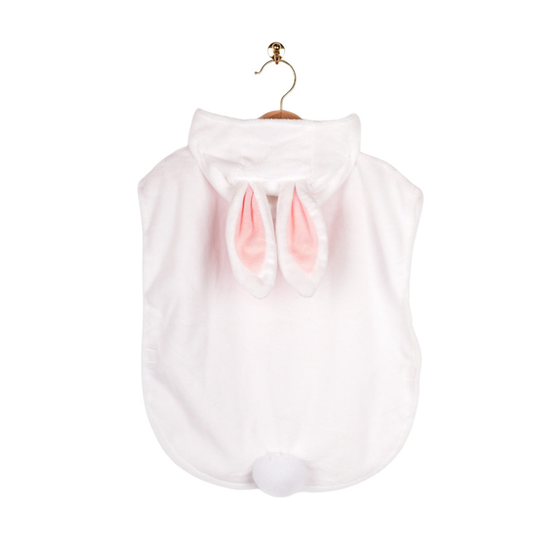 El disfraz se cierra con velcro por la parte delantera, incluye capucha cosida con orejas y una cola de conejo cosida en el final del disfraz. En ambos laterales tiene una banda elástica. Está fabricado con 100% poliéster.