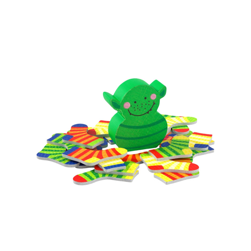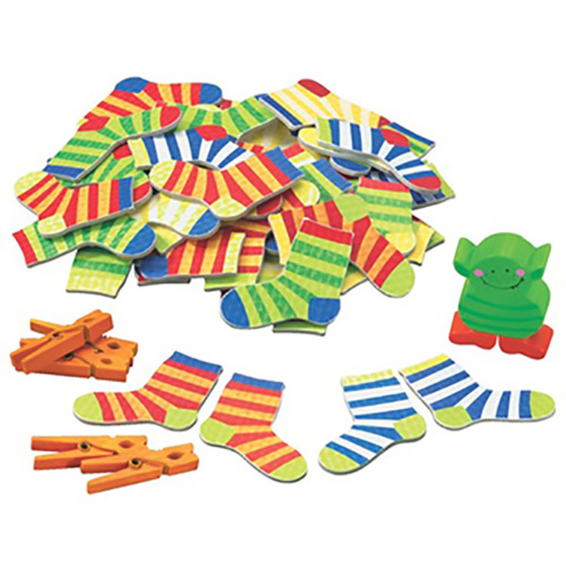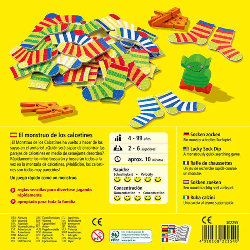 Incluye: 5 calcetines, 1 figura de monstruo de los calcetines de madera, 1 figura de polilla de madera, 15 fichas de pinzas de la ropa, 48 fichas de calcetines (24 parejas) e instrucciones