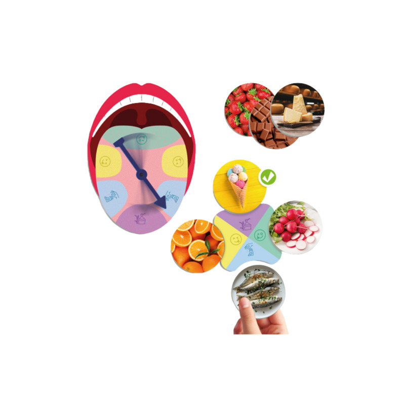 Este juego permite a los niños explorar el sentido del gusto de manera divertida y educativa. A través de imágenes reales, los pequeños aprenden a identificar alimentos según los sabores básicos: dulce, salado, amargo y ácido, y descubren de forma práctica la función de las papilas gustativas.