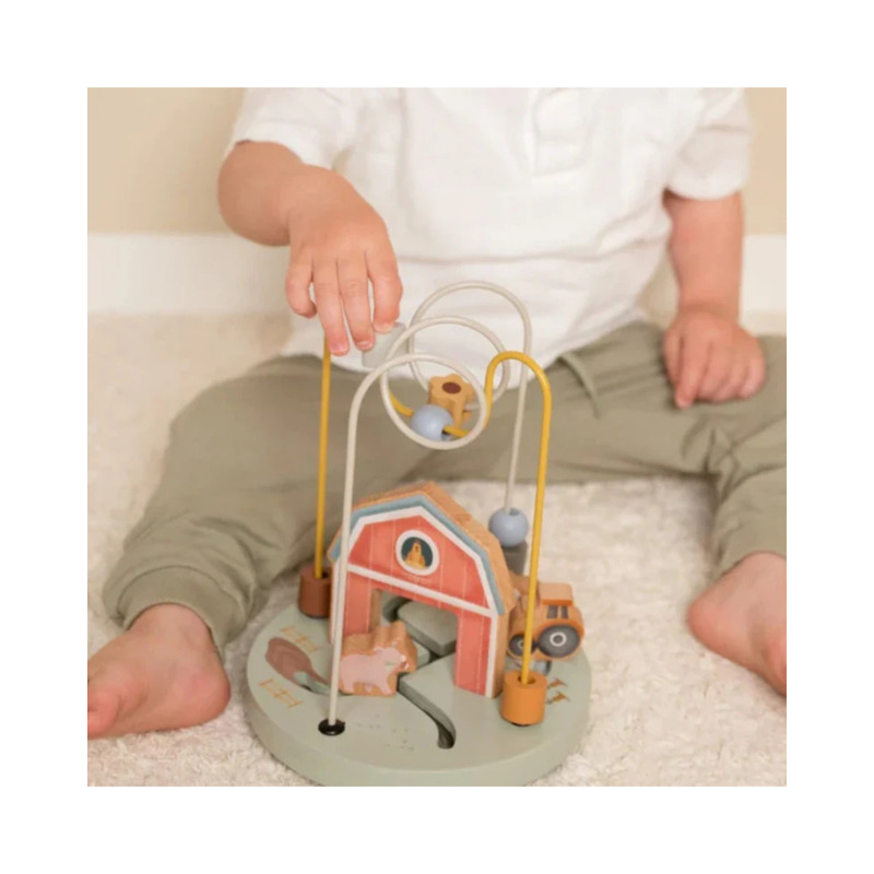 Espiral de actividades con cuentas de madera con temática de la granja, diseñada para que los más pequeños desarrollen la motricidad fina mientras desplazan los bloques de un lado a otro. Este juguete educativo fomenta la coordinación mano-ojo y el aprendizaje sensorial de manera divertida y segura.
