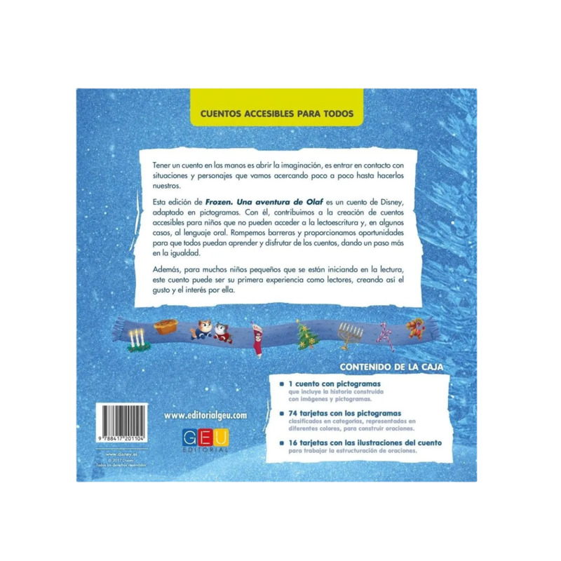 Frozen: una aventura de Olaf es la entrañable adaptación con pictogramas y letra mayúscula del famoso corto navideño de Disney. Un libro inclusivo y accesible, ideal para que los más pequeños disfruten de la lectura mientras fortalecen su comprensión y su vínculo con las historias que aman.