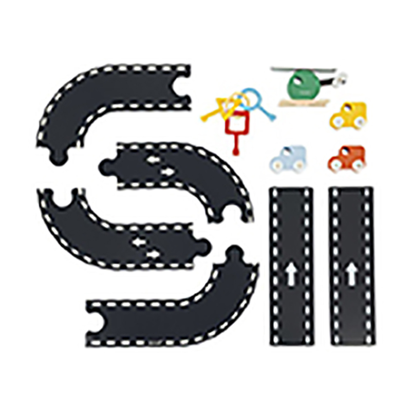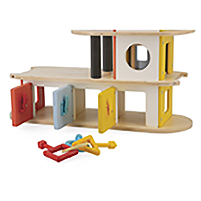 Con rampas, ascensor, lavado automático, y hasta un helipuerto, este garaje de madera trae todo para que cada niño/a disfrute creando sus propias historias. Incluye 3 coches y un helicóptero, además de llaves y cerraduras geométricas para que cada puerta sea única.