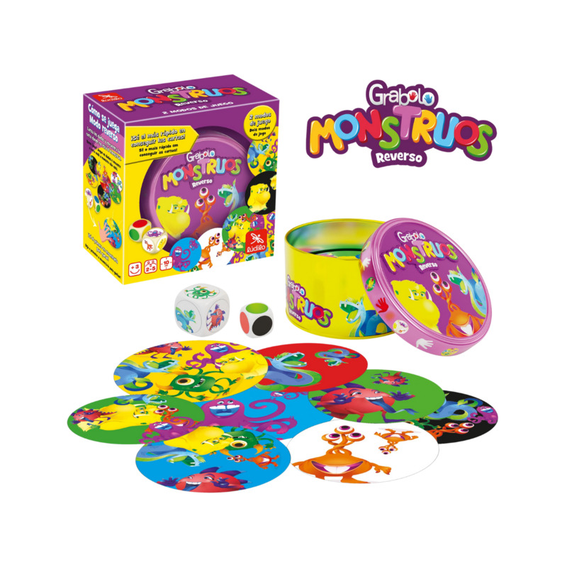 ¡El nuevo Grabolo Monstruos Reverso ofrece diversión doble con dos modos de juego! Los niños deben ser rápidos para encontrar las cartas correctas según los dados: ya sea la carta que coincida con la combinación de monstruo y color, o la carta que tenga el color indicado pero le falte el monstruo, dependiendo del modo que elijan.