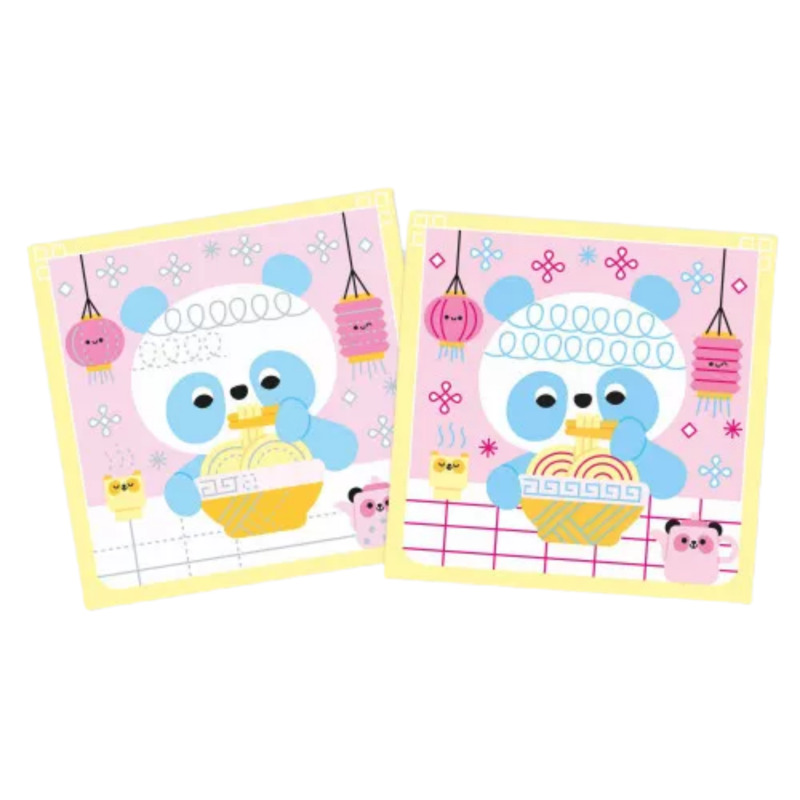 Incluye 4 cuadros reversibles borrables con divertidos animales y 2 rotuladores borrables, uno azul y otro rosa. Siguiendo las formas pretrazadas, los niños practicarán bucles, ondulaciones y elementos simétricos mientras decoran cada ilustración.