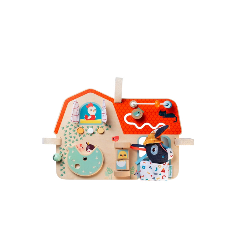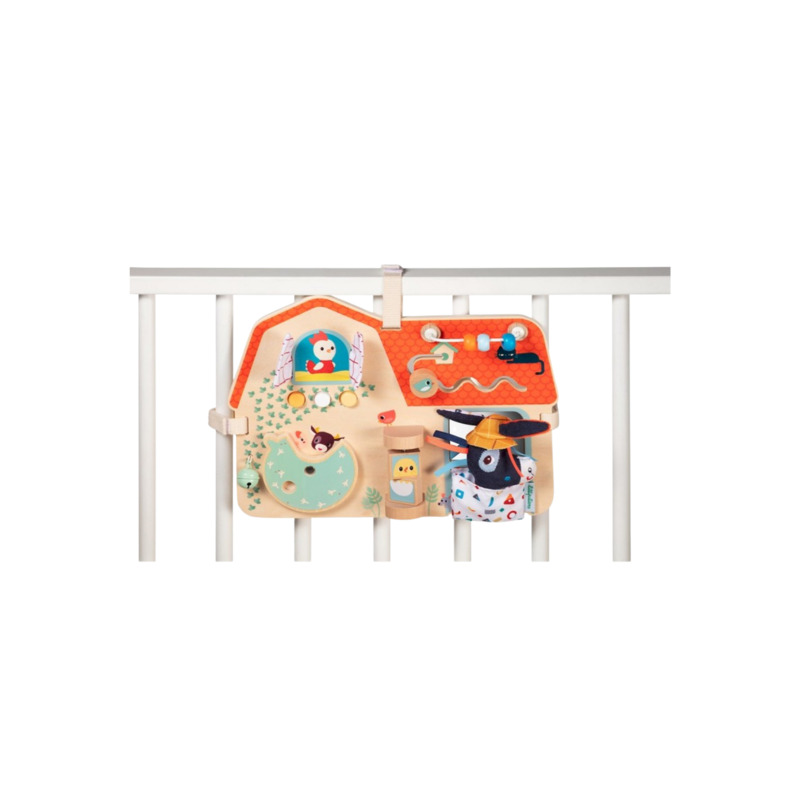 El panel sensorial de madera con forma de granja ofrece múltiples actividades para estimular la curiosidad y el desarrollo de los más pequeños. Fabricado con madera, pintura al agua y poliéster, combina diferentes texturas y colores para fomentar la motricidad fina. Se puede colgar fácilmente con velcro y las partes de tela son lavables a máquina a 30 °C. Apto para bebés a partir de 9 meses.