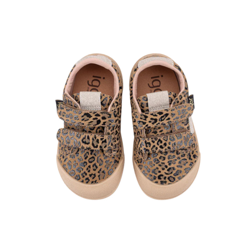 Las Igor Tennis Marrón combinan estilo y respeto por el desarrollo natural del pie infantil. Fabricadas en España con piel serraje rosa de alta calidad y un delicado estampado animal print con detalles laterales de glitter, aportan un toque divertido y moderno al look de las más pequeñas.