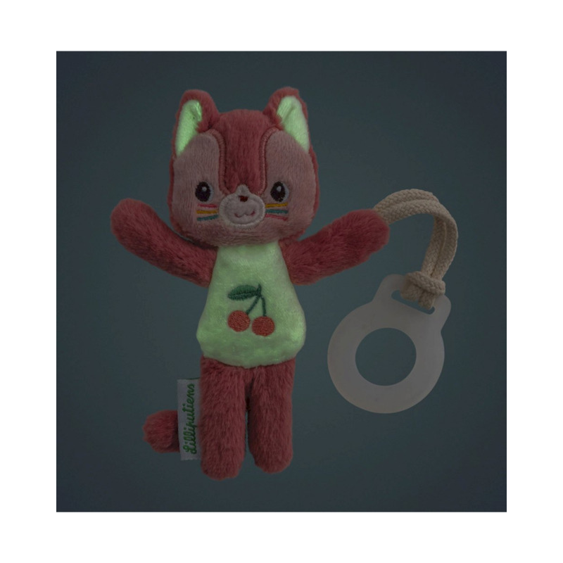 Por la noche, su barriguita y orejitas brillan en la oscuridad, ayudando al pequeño a encontrar fácilmente su chupete y aportando una sensación de calma y seguridad.