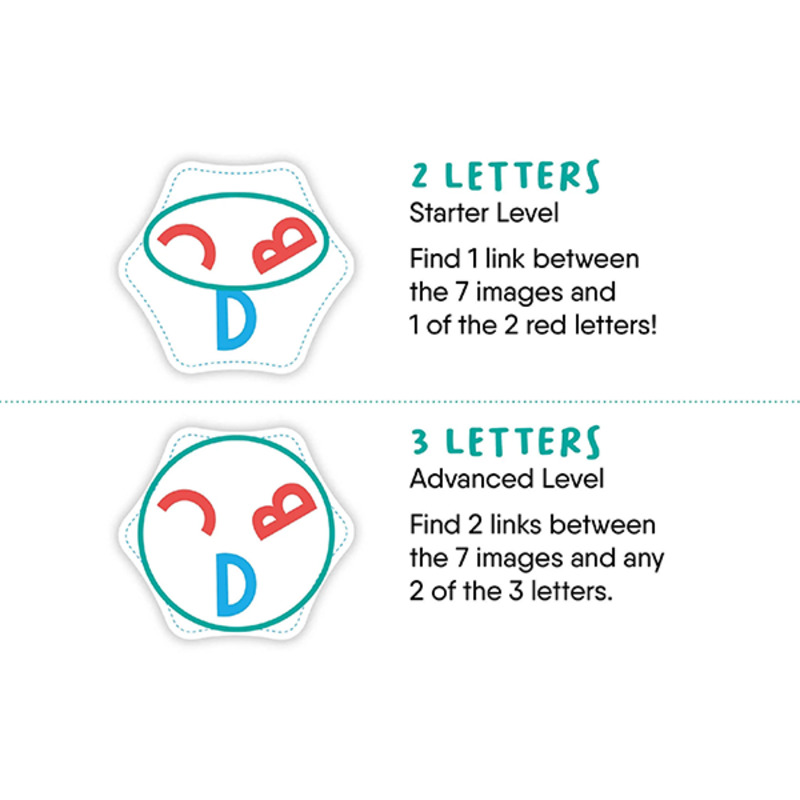 Enlaza Letras" de FLEXIQ. En este juego de cartas, cada jugador debe encontrar rápidamente la relación entre una letra y las imágenes en las cartas. ¡Quien lo haga primero, se lleva la carta! El juego tiene dos niveles de dificultad, por lo que es ideal para niños de diferentes edades y niveles.