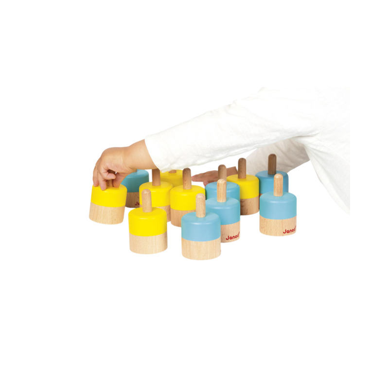 El set incluye 12 piezas (6 pares de sonidos distintos), cada una formada por una ficha amarilla y otra azul. Su sistema de autocorrección permite comprobar fácilmente las parejas gracias al círculo de color oculto en la base de cada pieza.