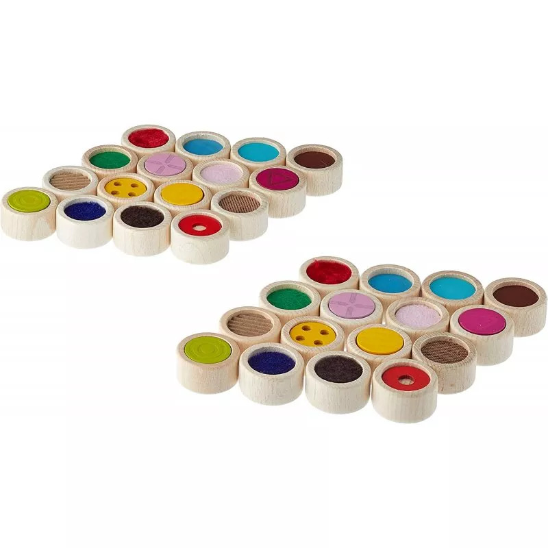 Este juego educativo consiste en encontrar dos almohadillas con el mismo relleno únicamente al tacto. Con 20 piezas diferentes, es ideal para desafiar y mejorar la memoria sensorial de los niños, mientras se divierten explorando texturas y formas.