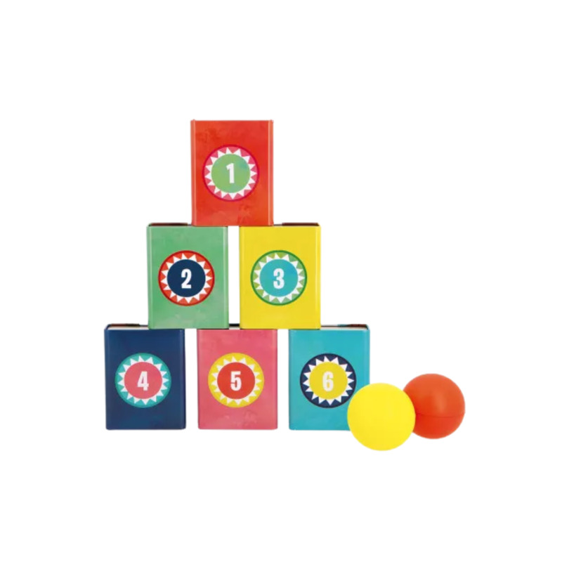 Este set incluye 6 cajas metálicas ilustradas con divertidos personajes y 2 pelotas de espuma fáciles de lanzar. Las cajas se pueden colocar con las ilustraciones o con los números visibles, para convertir cada partida en un reto de puntuación y cálculo básico.