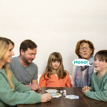 El juego «Make a Mooove» de FLEXIQ es ideal para que toda la familia se divierta mientras desarrolla habilidades de percepción y reacción rápida. Los jugadores deben lanzar los dados y ser los primeros en identificar el fruto correcto o imitar el sonido del animal indicado en la carta.