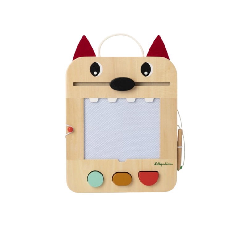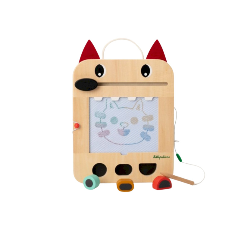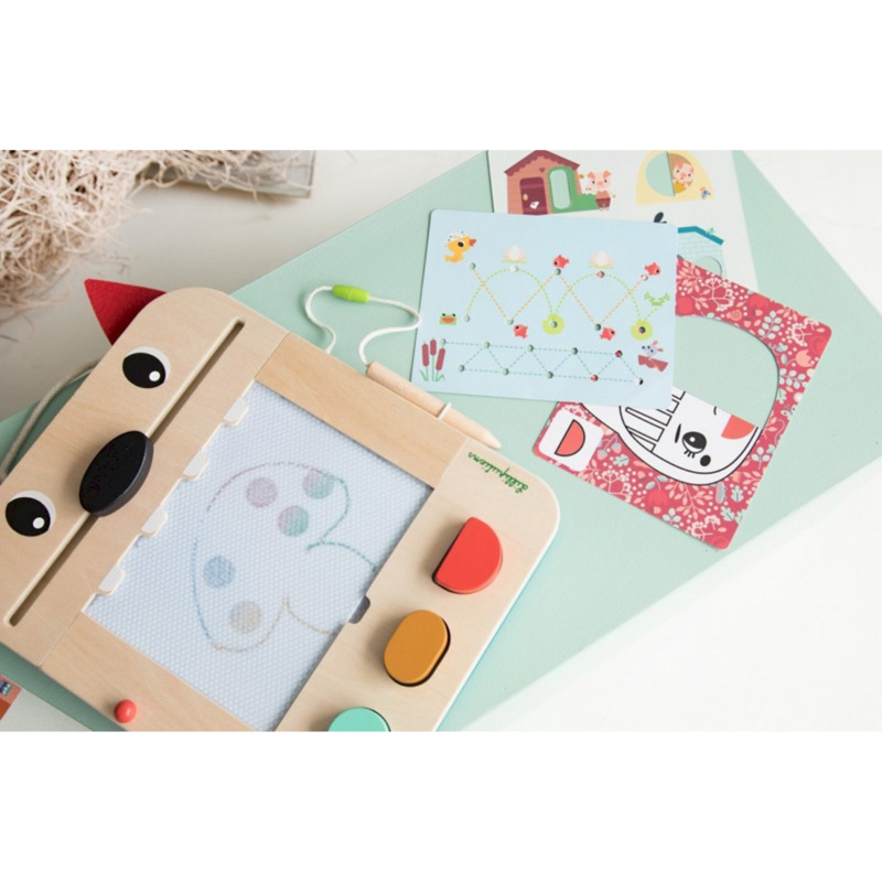La pizarra mágica de Louis el lobo permite a los niños dibujar, jugar y aprender de forma divertida. Incluye 3 sellos con formas geométricas, 6 tarjetas con 12 juegos y un lápiz de madera con cuerda para no perderlo. La nariz de Louis borra la pizarra fácilmente y las tarjetas se guardan en la ranura trasera.