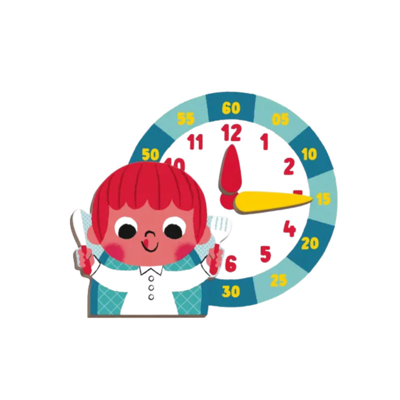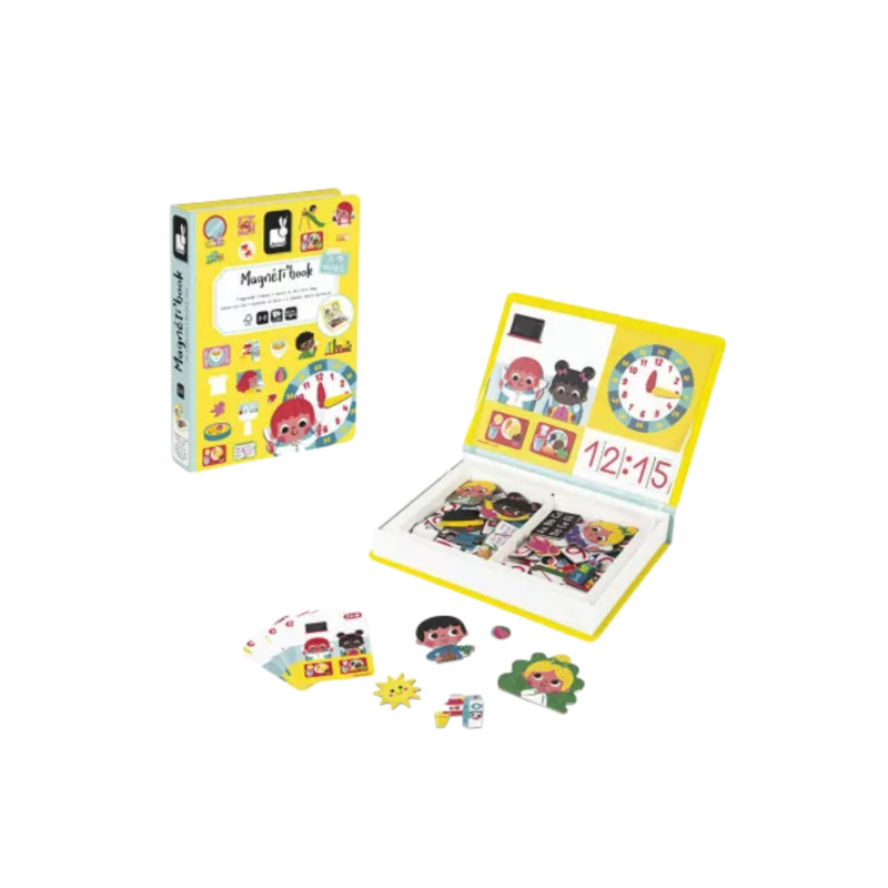 El juego consiste en reproducir las escenas diarias que aparecen en las tarjetas y colocar la hora correspondiente: ¿a qué hora desayuno?, ¿cuándo es la hora de dormir? Gracias a sus 75 imanes y 8 tarjetas de doble cara, los niños pueden recrear 16 escenas distintas mientras desarrollan su comprensión del tiempo, la observación y la motricidad fina.