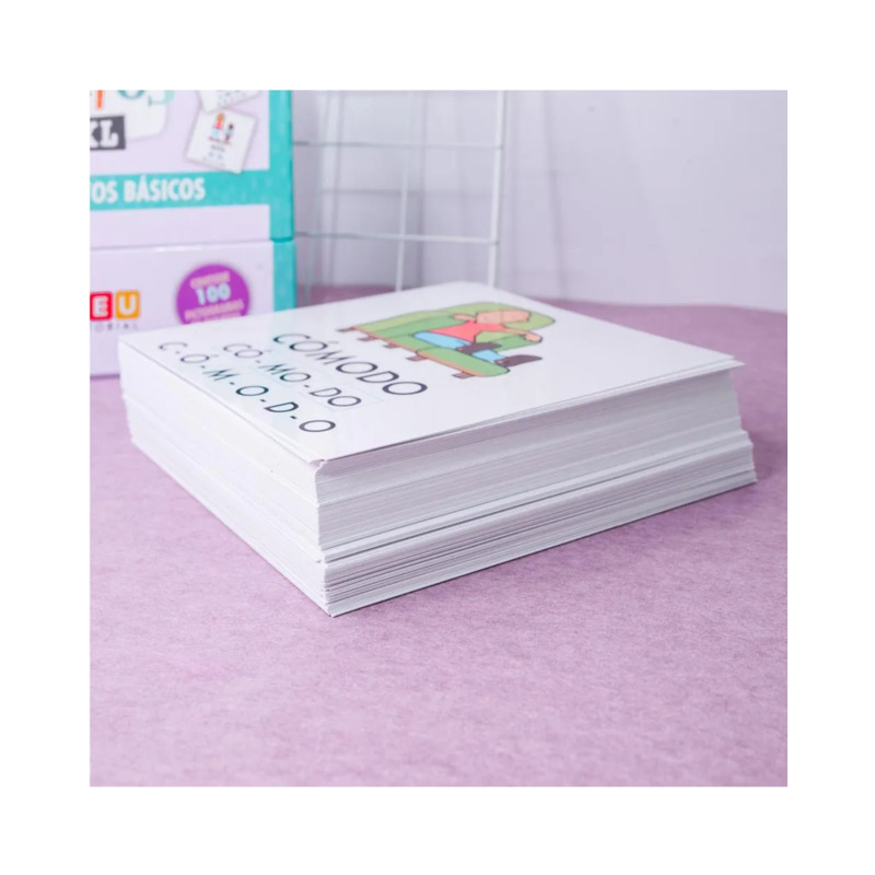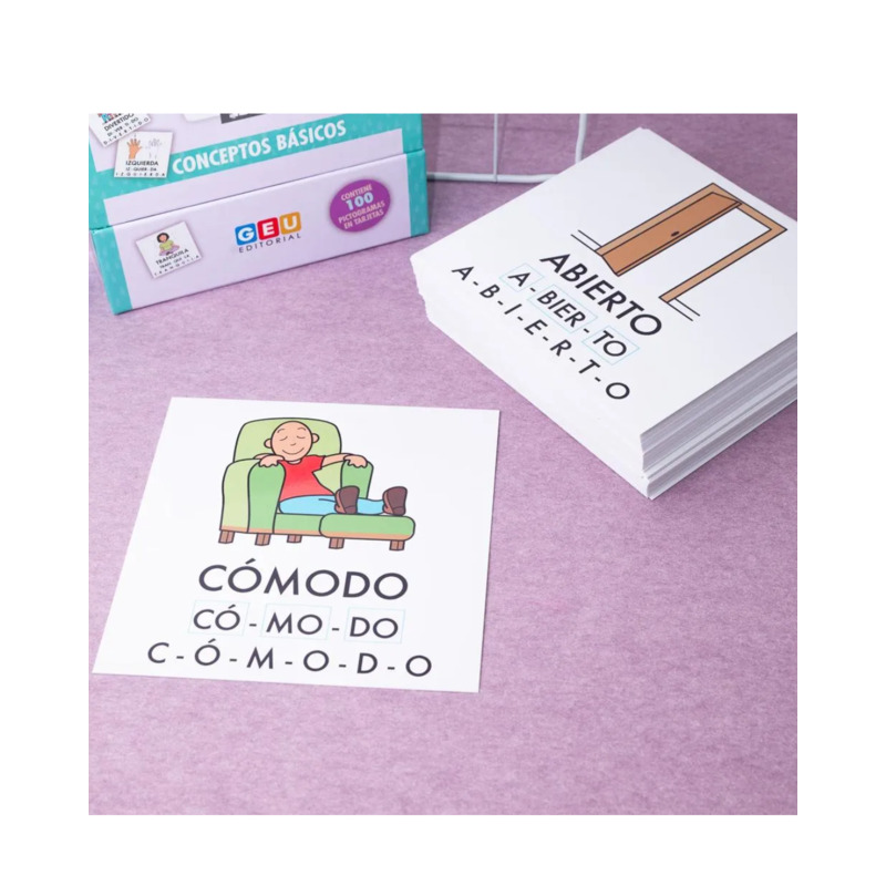 Cada tarjeta presenta el pictograma acompañado de la palabra en mayúscula, silabeada y letra a letra, lo que ayuda a trabajar la conciencia silábica y a establecer la relación entre fonema y grafema de forma sencilla.