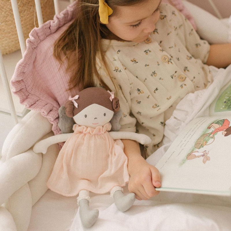 Angelina es una muñeca de tela pensada para acompañar a los/as peques desde el primer día. Está hecha con algodón 100% orgánico, un material suave y seguro, ideal para la piel delicada de los bebés. Su diseño incluye un vestido rosa, alas plateadas y botas a juego que la convierten en la compañera perfecta para abrazos y juegos. Al ser ligera y manejable, los niños pueden llevarla a todas partes fácilmente. Es muy fácil de limpiar: solo necesitas un paño húmedo y un poco de jabón suave. Además, es sostenible, biodegradable y fabricada bajo prácticas responsables.