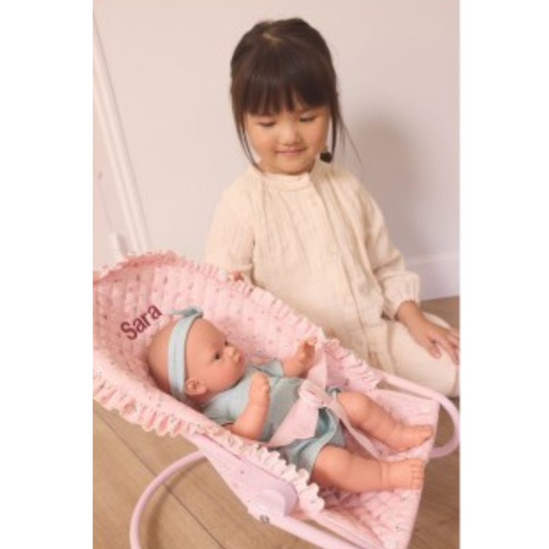 Viste un vestido con estampado de puntitos y diadema a juego, confeccionados en algodón natural lavable a máquina. Su diseño sin pelo ni pestañas y ojos grisáceos aporta un aire delicado y realista, característico de la colección Monnëka. Fabricado en España con materiales seguros y de alta calidad.