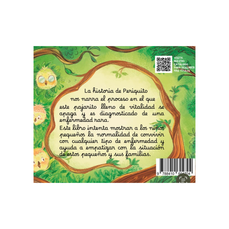 Este álbum ilustrado cuenta la historia de Periquito, un pequeño pájaro que enfrenta una enfermedad rara. A través del cuento, ayuda a los niños a comprender la convivencia con la enfermedad, a desarrollar empatía y normalizar distintas realidades. Una lectura emotiva para pequeños lectores y familias.