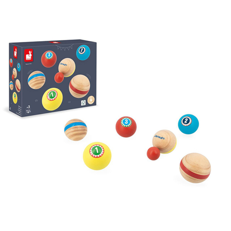 Tradicional juego francés adaptado. Este set incluye 6 bolas de madera de colores y un boliche, todo presentado en una práctica bolsa de algodón para llevar a cualquier parte.