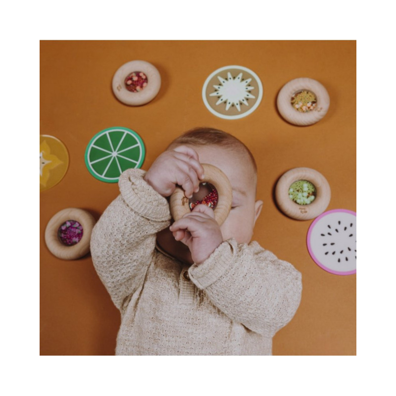 En su interior, podréis identificar figuras de frutas y verduras, que al agitarse desatan el irresistible sonido marca de la casa. Aunque apetece comérselo, está hecho de madera de haya natural, libre de tóxicos y a prueba de mordiscos.
