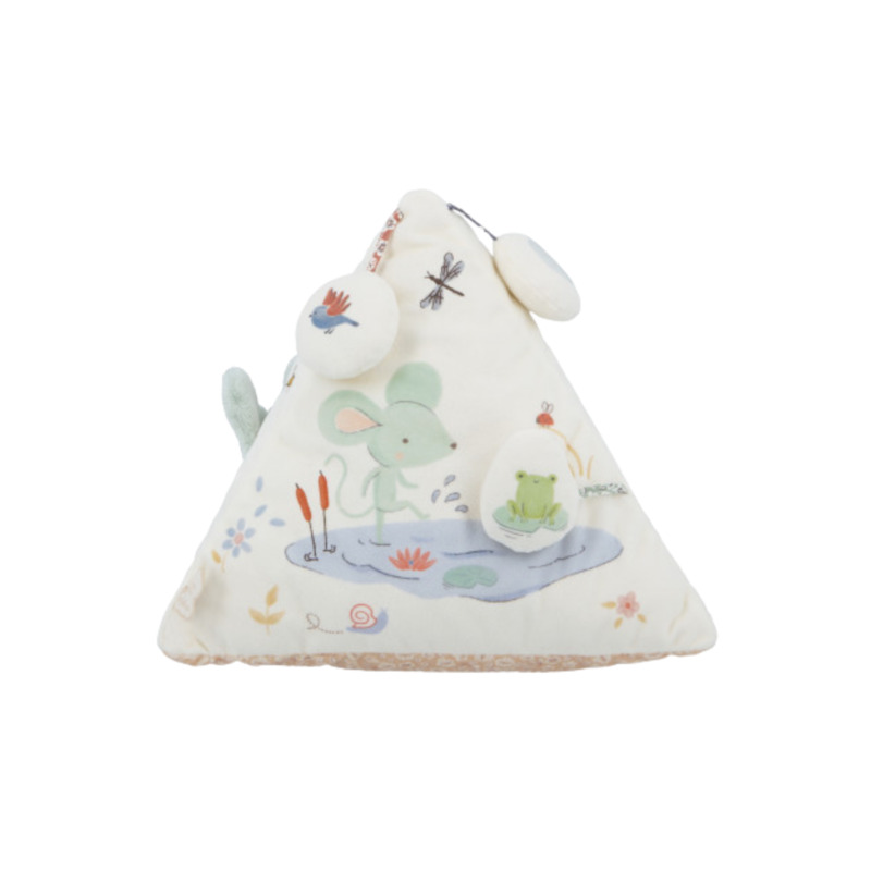 Inspirada en las canciones infantiles clásicas de la colección Petites Chansons —Un conejito, Estrellita, ¿dónde estás? y El ratón verde—, esta pirámide multisensorial fomenta la coordinación, la audición y la curiosidad del bebé mediante diferentes elementos para tocar, sacudir, oír y rascar.