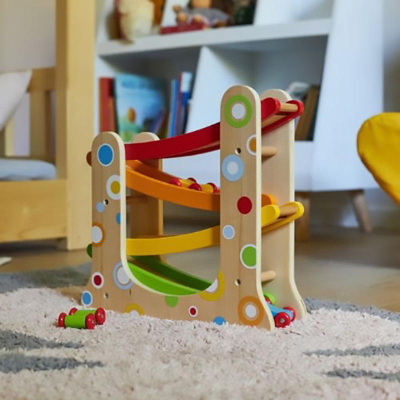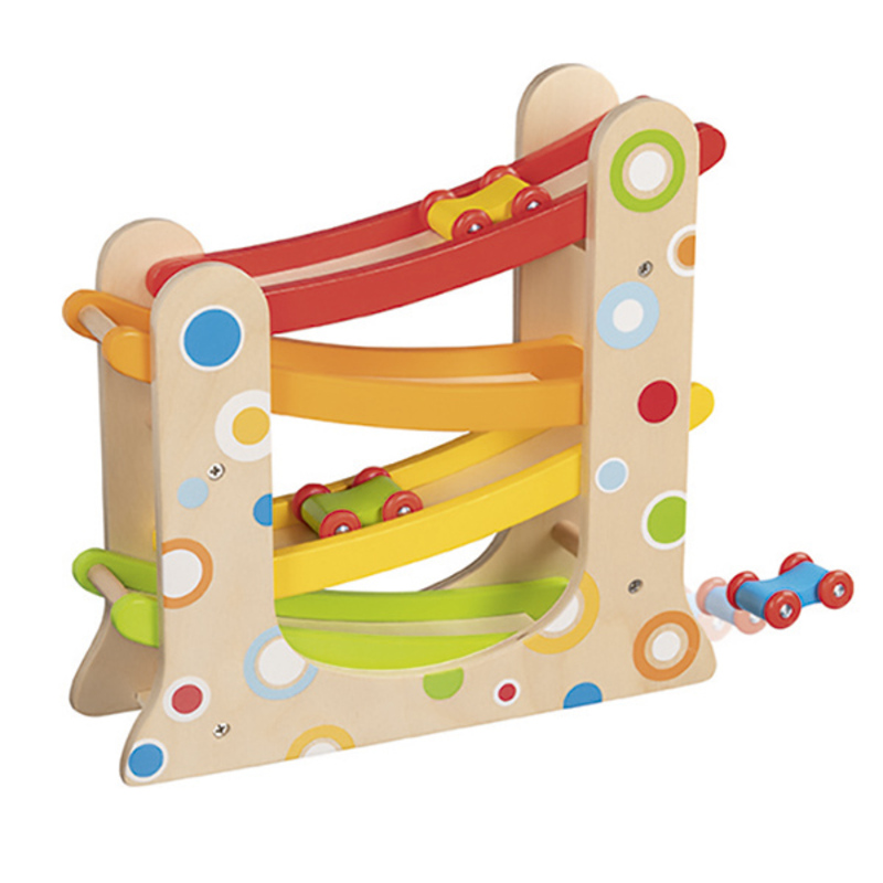 ¡La diversión a toda velocidad con esta pista de carreras de madera! Incluye tres coches que descienden rápidamente desde lo alto, ayudando a los niños a mejorar su coordinación mano-ojo mientras disfrutan de carreras llenas de emoción.