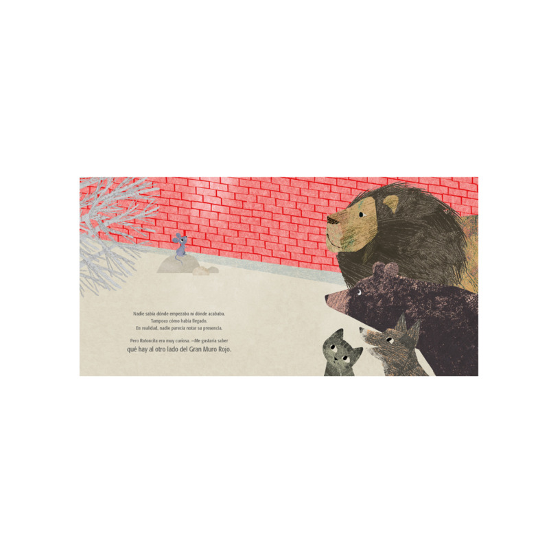 Ratoncita se enfrenta a un gran muro rojo que la separa de lo desconocido. Con valentía, decide cruzarlo, descubriendo un mundo lleno de sorpresas y nuevas posibilidades.
