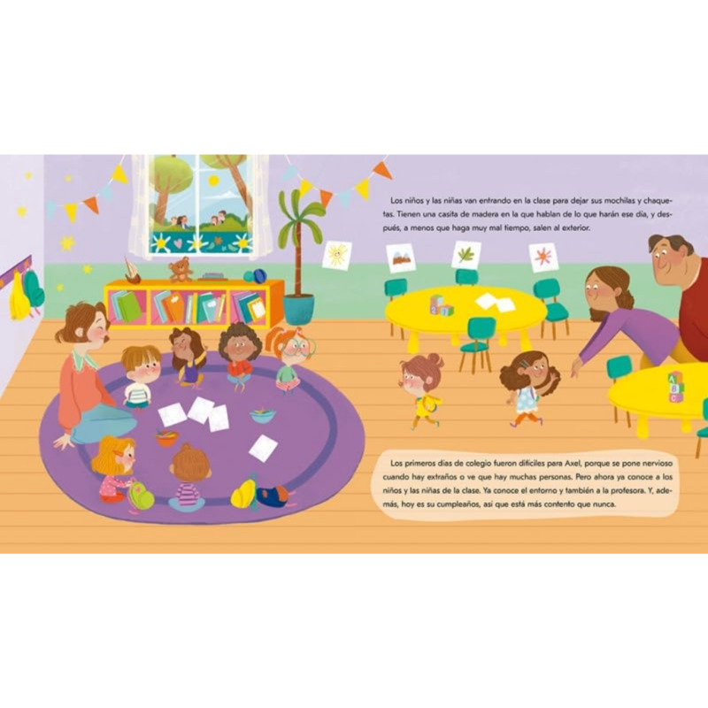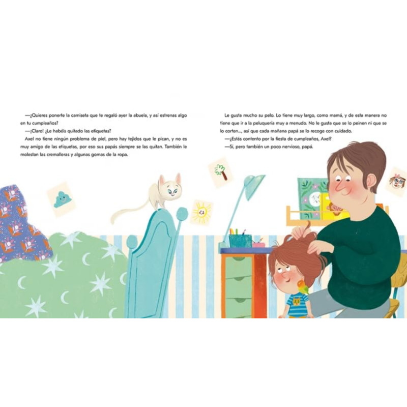 Axel es un niño como cualquier otro, aunque hay cosas que lo hacen diferente. No le gustan los ruidos fuertes, ni ciertos tejidos, ni los juegos de correr, pero disfruta observando las nubes, le encantan los animales y llevar el pelo largo. El día de su cumpleaños se enfrenta a una fiesta llena de estímulos y de niños muy distintos entre sí, lo que le genera dudas e inquietudes. A través de esta historia cercana y emotiva, el cuento invita a comprender y respetar las diferentes sensibilidades como una fuente de diversidad y riqueza.