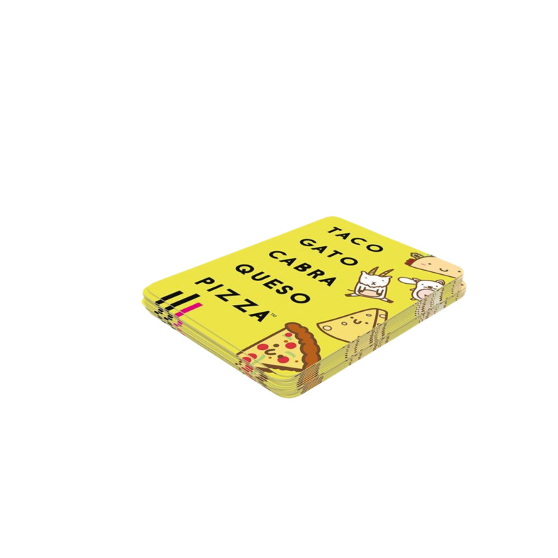 Taco Gato Cabra Queso Pizza es un divertido y frenético juego de cartas en el que la rapidez y la concentración son clave. Los jugadores deben ir descartando sus cartas al ritmo de las palabras “taco, gato, cabra, queso, pizza”. Cuando una carta coincida con la palabra pronunciada, todos deben colocar rápidamente la mano sobre el montón central: el último en hacerlo se lleva todas las cartas.