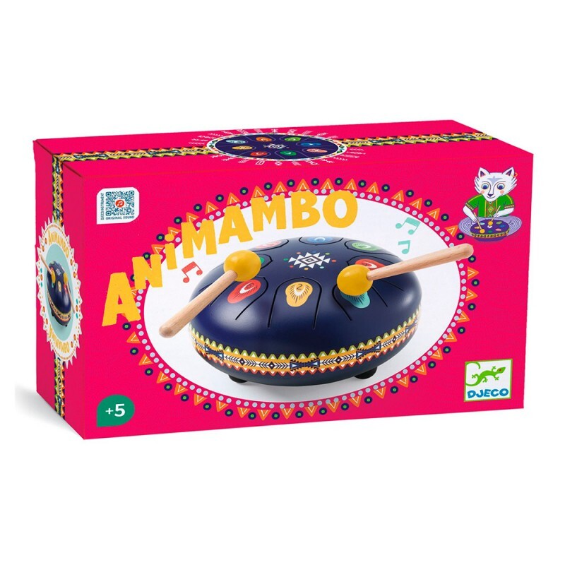 Decorado con ilustraciones de inspiración india, este tambor tiene 8 lengüetas que producen diferentes notas musicales.