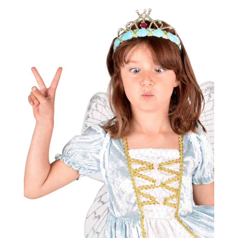 La tiara está revestida con terciopelo triturado en color rojo y lleva una cinta dorada trenzada a su alrededor. Con hermosas perlas y un precioso frente grande de plexiglás en color rosa.