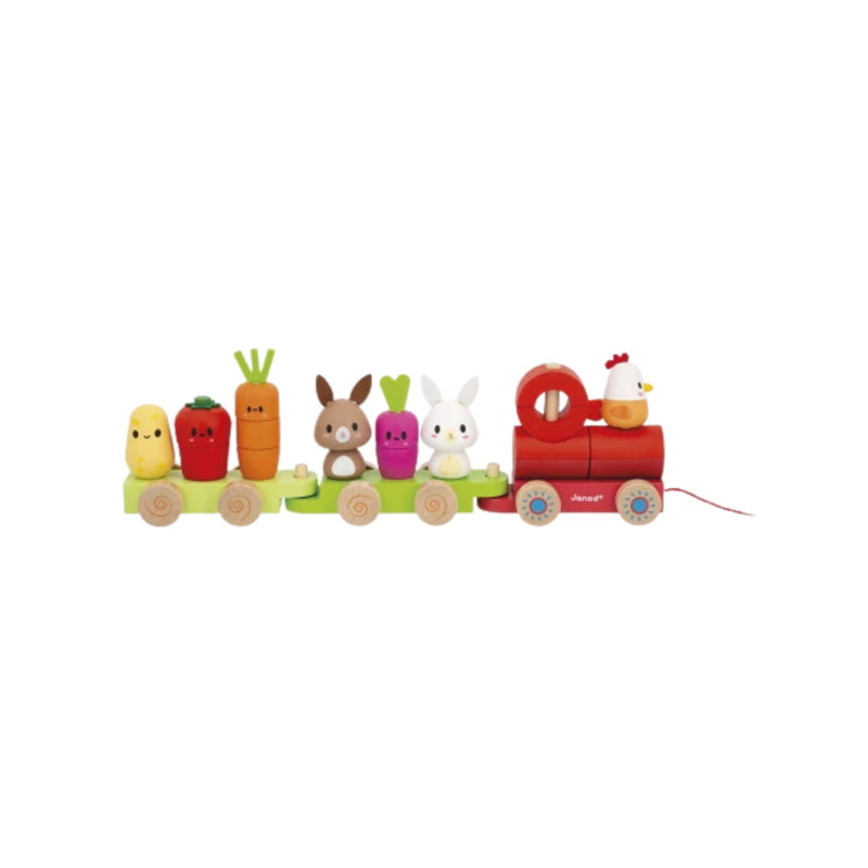 El set incluye piezas para montar y reconstruir diferentes elementos del entorno rural, como patatas, tomates, zanahorias, rábanos, conejos y una gallina. Cada pieza está cuidadosamente elaborada para fomentar la creatividad, la coordinación y la motricidad fina. Además, el tren incorpora una cuerda de arrastre que permite a los niños practicar la motricidad gruesa mientras lo pasean por toda la casa.