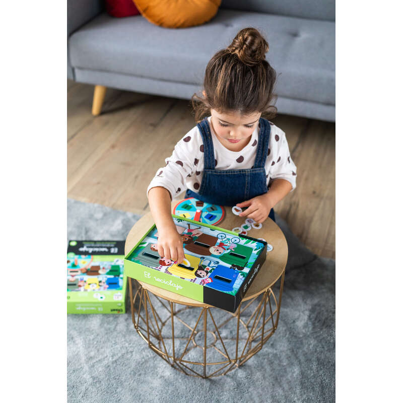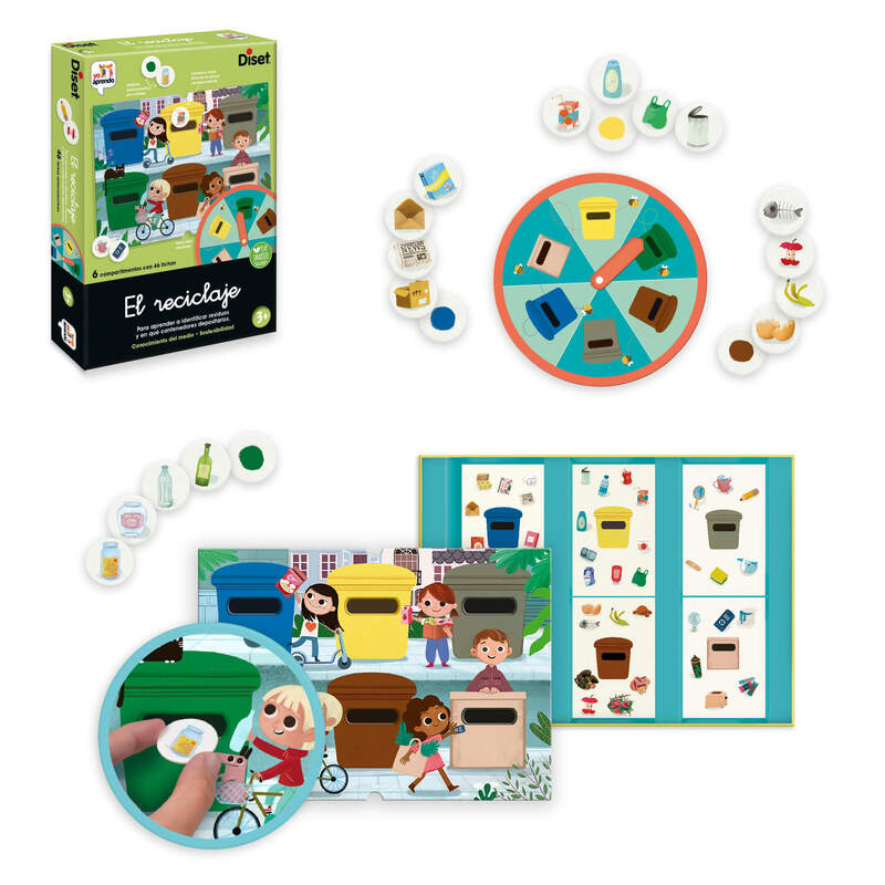 Juego educativo que plantea 5 actividades distintas relacionadas con el reciclaje que enseñan a identificar los distintos residuos, separarlos en función de su tipología y aprender a ubicarlos en el contenedor de reciclaje que le corresponda. El juego es autocorrectivo: en el dorso de todas las fichas de residuo aparece el color del contenedor al que tiene que ir dicho residuo. El juego incluye una guía didáctica con acciones cotidianas que entre todos podemos realizar para tener un mundo más sostenible.